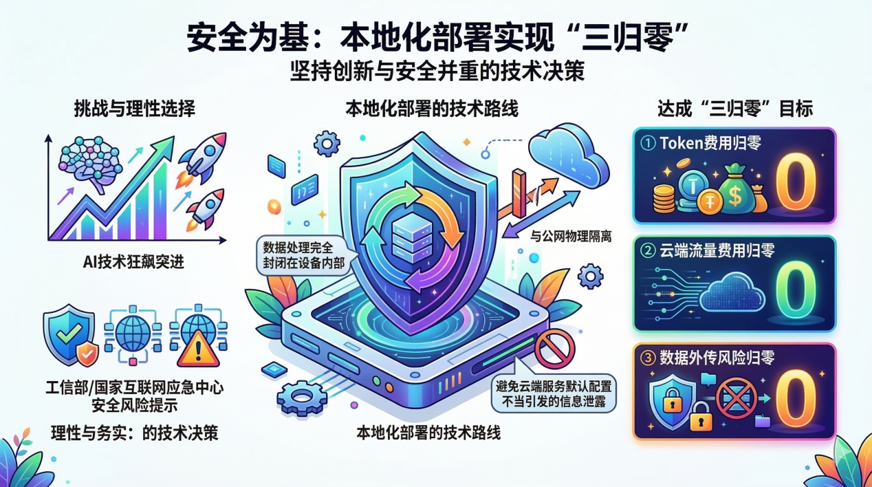 在AI技術(shù)狂飆突進(jìn)的同時(shí),技術(shù)團(tuán)隊(duì)展現(xiàn)出了難得的理性與務(wù)實(shí)。面對(duì)工信部、國(guó)家互聯(lián)網(wǎng)應(yīng)急中心發(fā)布的安全風(fēng)險(xiǎn)提示,團(tuán)隊(duì)選擇了一條“擁抱創(chuàng)新與嚴(yán)守安全并重”的技術(shù)路線。技術(shù)團(tuán)隊(duì)積極探索,通過(guò)本地化部署AI大模型,逐步通過(guò)將數(shù)據(jù)處理流程完全封閉在設(shè)備內(nèi)部完成,實(shí)現(xiàn)了核心數(shù)據(jù)不出網(wǎng)。這一舉措從根本上規(guī)避了因云端服務(wù)默認(rèn)配置不當(dāng)引發(fā)的信息泄露風(fēng)險(xiǎn),在有效保障數(shù)據(jù)安全的前提下,逐步達(dá)成了Token費(fèi)用、云端流量費(fèi)用及數(shù)據(jù)外傳風(fēng)險(xiǎn)的“三歸零”。