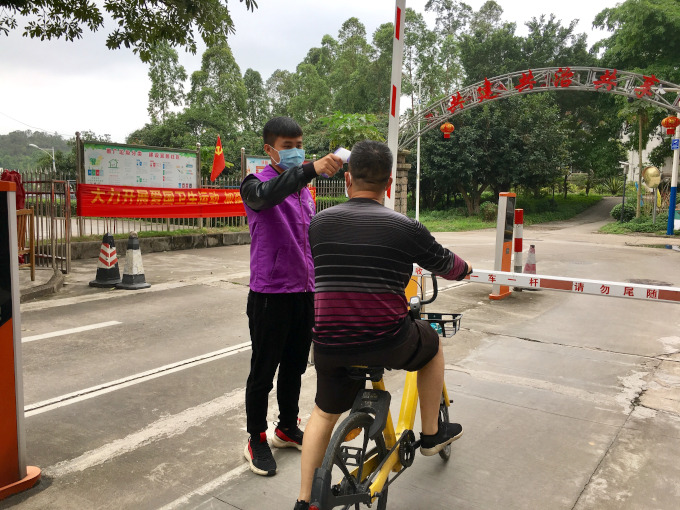 退役在校大學(xué)生何波堅守疫情防控一線 被評為五桂山十佳志愿服務(wù)明星  何波在小區(qū)門崗測量體溫。