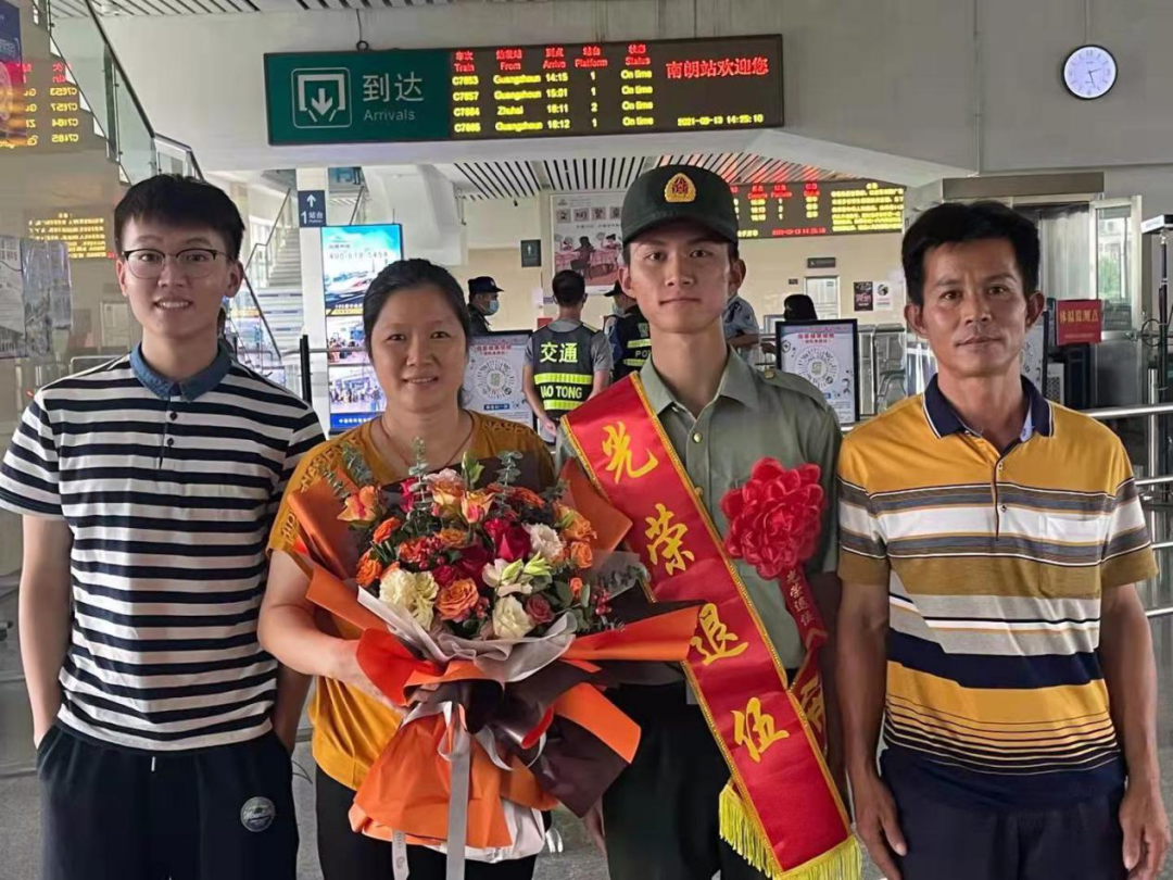 “去時(shí)鑼鼓喧天,歸來夾道歡迎?!?/p> 九月,正是退役軍人 從祖國各座軍營 返回家鄉(xiāng)的退役季 為營造“一次參軍、一生光榮”的濃厚氛圍 讓退役軍人感受到家鄉(xiāng)人民的熱情和關(guān)懷 激發(fā)老兵退伍不褪色 返鄉(xiāng)建新功的壯志熱情 9月13日下午,五桂山街道2021年首位退役軍人曾世紀(jì)光榮退役返鄉(xiāng)。街道退役軍人服務(wù)中心負(fù)責(zé)人、社區(qū)“兩委”干部、工作人員以及曾世紀(jì)的父母早早手持鮮花,在城軌南朗站等候迎接世紀(jì)回家。 回想2019入伍歡送大會(huì)時(shí)曾世紀(jì)代表五桂山即將入伍的新兵作表態(tài)發(fā)言,那年,他主動(dòng)請(qǐng)纓,到艱苦邊遠(yuǎn)地區(qū)服役。“參軍不僅是個(gè)人的榮耀,也是家人的榮耀,更是鄉(xiāng)親們的榮耀。到了部隊(duì)后我會(huì)堅(jiān)決服從命令,聽從指揮,刻苦訓(xùn)練,勤學(xué)本領(lǐng),絕不辜負(fù)家鄉(xiāng)人民的期望!”
