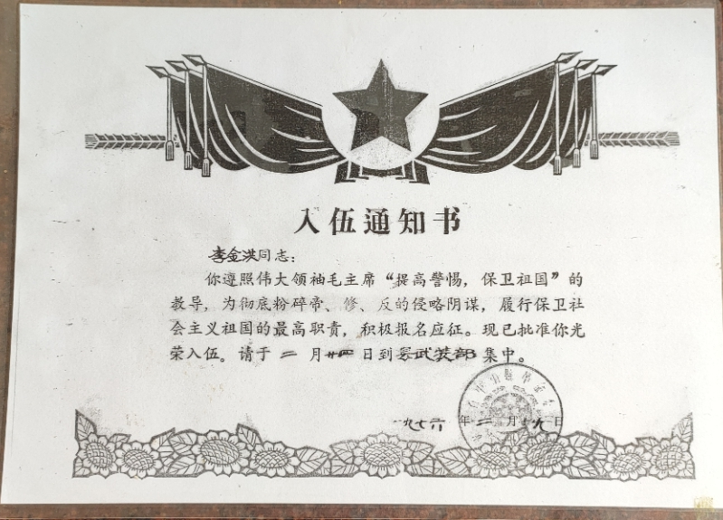 1976年2月,李金洪(第一排右二)春季應(yīng)征入伍大合照 炮火洗禮,浴血奮戰(zhàn) 1979年2月17日,天還未亮,中越邊境線上萬炮齊發(fā),漆黑的天空霎時(shí)被炮火染紅。震耳欲聾的炮火聲、沖鋒陷陣的吶喊聲如同驚雷般在李金洪耳邊炸響,令他熱血沸騰,一片空白的腦海瞬間被浴血?dú)?、奪取勝利的斗志填滿。 這是李金洪作為53258部隊(duì)尖刀班機(jī)槍手參加1979年對(duì)越自衛(wèi)反擊戰(zhàn)的記憶。當(dāng)時(shí),尖刀班肩負(fù)著沖在隊(duì)伍最前方、為主力部隊(duì)擋下槍炮等最為急難險(xiǎn)重的任務(wù)。 從2月17日到3月16日,從靠松山到三埡口,在持續(xù)一個(gè)月的山地戰(zhàn)爭(zhēng)中,李金洪和戰(zhàn)友們每天僅靠吃干糧野果、喝河水充饑,整整一個(gè)月的時(shí)間里衣服干了又濕,濕了又干,有時(shí)受傷之后,傷口和衣服都粘在一起,疼痛無比。當(dāng)時(shí)雖然又累又困,但是戰(zhàn)士們的眼睛始終都是保持睜開的,因?yàn)閿橙穗S時(shí)都會(huì)出現(xiàn)在附近,瞬間就是你死我活的戰(zhàn)場(chǎng)。就這樣,李金洪一直以堅(jiān)定信念和頑強(qiáng)精神在戰(zhàn)場(chǎng)殺敵,直到戰(zhàn)爭(zhēng)結(jié)束。 生死一瞬間,火線立軍功 1979年3月10日,尖刀班接到了去三埡口搜山的任務(wù),突然與敵軍遭遇,當(dāng)時(shí)尖刀班只配備了一挺機(jī)槍,而李金洪就是機(jī)槍手,當(dāng)時(shí)由于地形對(duì)我方不利,不便發(fā)動(dòng)火力打擊和進(jìn)行蔭蔽工作。這時(shí),班長(zhǎng)一邊指揮2名戰(zhàn)士立即下山給后方的大部隊(duì)報(bào)信,一邊組織全班沉著埋伏,等待敵人靠近。 當(dāng)敵人離陣地只有幾米時(shí),作為班里唯一機(jī)槍手的李金洪突然挺起機(jī)槍準(zhǔn)備開火,敵軍看到機(jī)槍慌亂朝他射擊,李金洪迅速閃躲,避開飛來的子彈,隨即向敵人開火,首發(fā)即擊斃領(lǐng)頭敵軍,并成功搶占有利地形,用猛烈的火力掩護(hù)全班戰(zhàn)斗,敵人四處逃竄。 僅用半小時(shí),尖刀班就消滅了4名敵人、俘虜1名,繳獲半自動(dòng)步槍2支,并且全班無一人員傷亡,打下一場(chǎng)漂亮的伏擊戰(zhàn)??克缮健|溪、高平、茶靈、廣淵、下瑯……對(duì)越自衛(wèi)反擊戰(zhàn)期間,李金洪保家衛(wèi)國(guó)浴血奮戰(zhàn),出色地完成了上級(jí)交給的護(hù)衛(wèi)和戰(zhàn)斗任務(wù),榮立個(gè)人三等功1次。