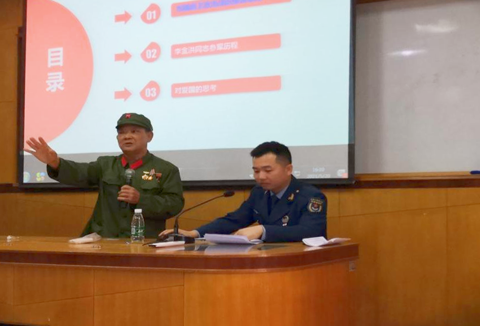 戰(zhàn)后李金洪(第四排左四)與全連戰(zhàn)友合影 愛國(guó)主義教育的紅旗志愿者 無論是在戰(zhàn)場(chǎng)上還是在和平年代,無論是身在部隊(duì)還是脫下軍裝,李金洪都始終保持著軍人的作風(fēng),也始終堅(jiān)守著忠于祖國(guó)、熱愛人民的精神信仰。李金洪不忘初心、牢記使命,用實(shí)際行動(dòng)詮釋了“退伍不褪色、退役不退志、離軍不離黨”的退役軍人品質(zhì)。 在建黨100周年舉國(guó)同歡的日子里,李金洪受邀參加神灣鎮(zhèn)“老黨員講黨史,憶崢嶸感黨恩”主題活動(dòng)?;顒?dòng)上,李金洪以“我和我的祖國(guó)”為題與神灣中學(xué)915名師生共同回憶1979年那段崢嶸歲月,講述了為捍衛(wèi)國(guó)家和人民利益而進(jìn)行的無畏戰(zhàn)斗,在場(chǎng)師生無不為之動(dòng)容,深感到今日幸福生活來之不易。 由于身體患病,李金洪說起話來不是很連貫,甚至不能長(zhǎng)時(shí)間說話。但他義無反顧的接受邀請(qǐng),成為愛國(guó)主義教育的紅旗志愿者,目的是為了讓年輕一代更加熱愛祖國(guó)、熱愛人民和熱愛生活。
