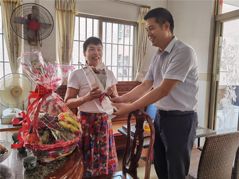 ▲南頭鎮(zhèn)退役軍人服務(wù)中心走訪慰問邊防海防現(xiàn)役軍人母親。 每到一戶,南頭鎮(zhèn)退役軍人服務(wù)中心主任黃國全都為“兵媽媽”獻上鮮花和果籃,并了解邊防海防現(xiàn)役軍人在部隊的服役情況,以及家屬身體狀況、生活、工作等情況,對她們默默支持孩子為國防建設(shè)作貢獻致以崇高的敬意。 “謝謝你們今天專程來看望我,我感到黨和國家對軍人軍屬越來越重視,作為邊防軍人家屬尤其感到驕傲和自豪!我們將一如既往地支持他在邊防站好崗、放好哨,為國防出力!”邊防官兵何財華媽媽說道。 |