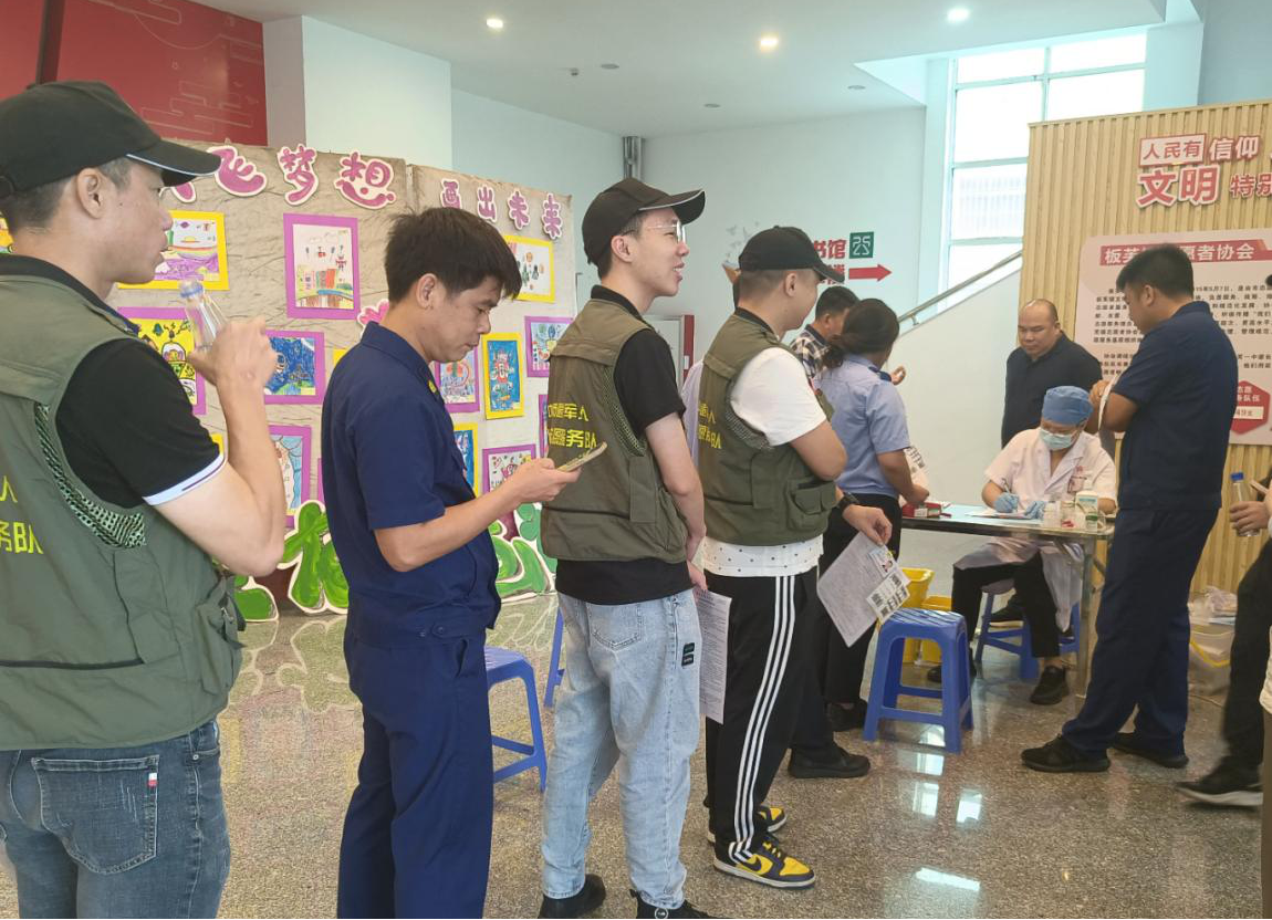 板芙鎮(zhèn)退役軍人紅旗志愿服務(wù)隊(duì)隊(duì)員排隊(duì)等候無(wú)償獻(xiàn)血。