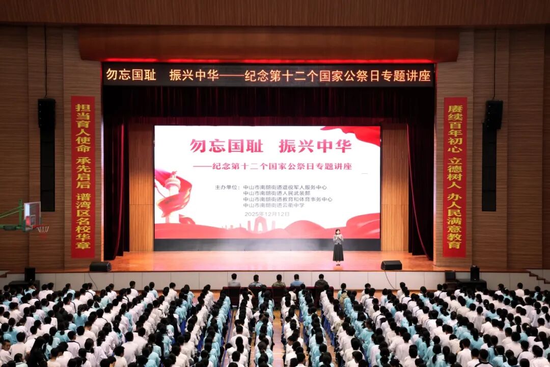 以史為鑒,砥礪前行。在第十二個南京大屠殺死難者國家公祭日即將到來之際,12月12日下午,中山南朗街道人民武裝部、退役軍人服務(wù)中心聯(lián)合南朗街道教育和體育事務(wù)中心在中山紀念中學(xué)教育集團云衢中學(xué)開展愛國主義教育,700余名師生齊聚一堂,緬懷遇難同胞、傳承愛國精神。