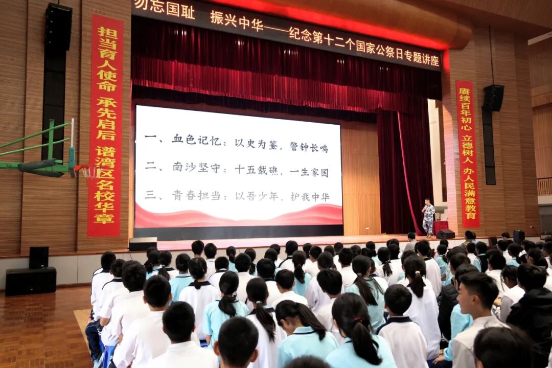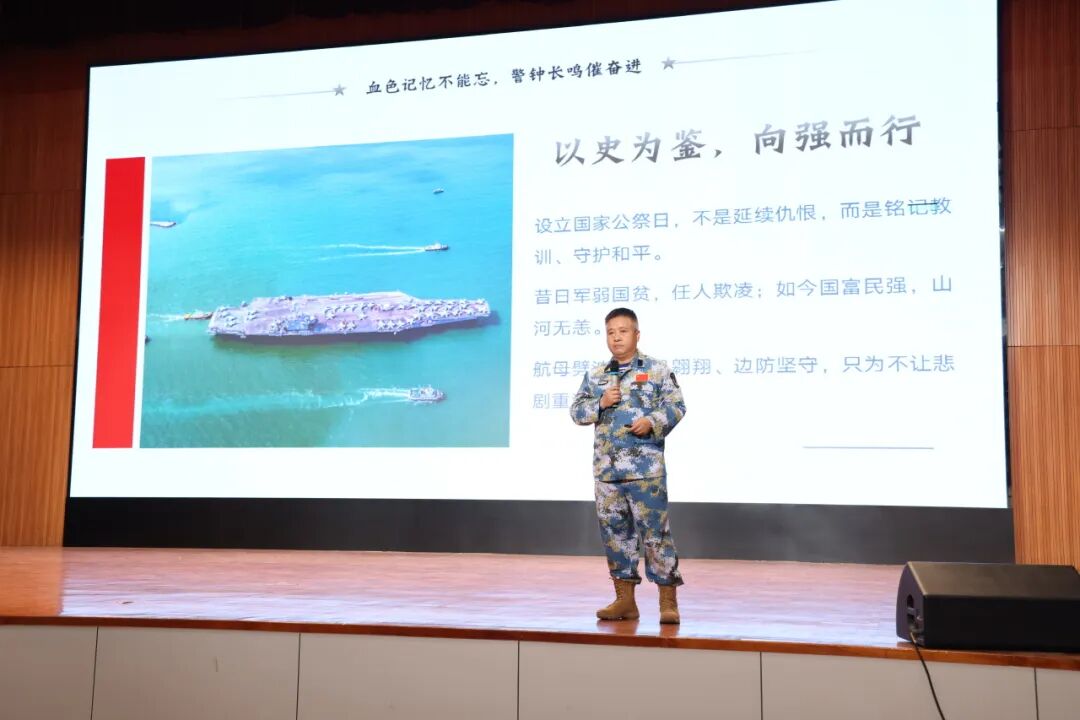 活動邀請中山港口鎮(zhèn)人民武裝部副部長賀洪彪以《銘記歷史守海疆 青春立志報家國》為題開展專題講座,帶領(lǐng)師生重溫南京大屠殺那段山河破碎的屈辱歷史,闡釋國家公祭日的設(shè)立意義,讓師生深刻理解“銘記歷史、勿忘國恥”的意義?,F(xiàn)場莊嚴肅穆,全體師生為南京大屠殺死難同胞默哀,用無聲的敬意寄托對逝者的哀思。 會上,賀洪彪結(jié)合自身十五載南沙守礁經(jīng)歷,講述“以礁為家、以苦為榮”的崢嶸歲月,用軍人的忠誠與信仰,詮釋新時代國防衛(wèi)士守護家國的責任擔當,讓師生們真切感受到和平生活的來之不易。