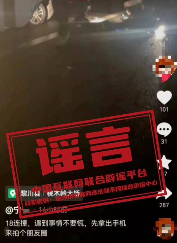 真相:近日,有網(wǎng)民在某網(wǎng)絡(luò)平臺發(fā)布“江西黎川境內(nèi)福銀高速贛閩交界處發(fā)生一起18車連撞重大交通事故”的視頻。經(jīng)向?qū)俚馗咚俳痪藢?,黎川高速路段并未發(fā)生18車連撞事故,該視頻信息系謠言。目前,警方已依法對散布網(wǎng)絡(luò)謠言視頻者予以行政處罰,并責(zé)令其刪除相關(guān)不實視頻。(來源:“撫州網(wǎng)警”微信公眾號)
