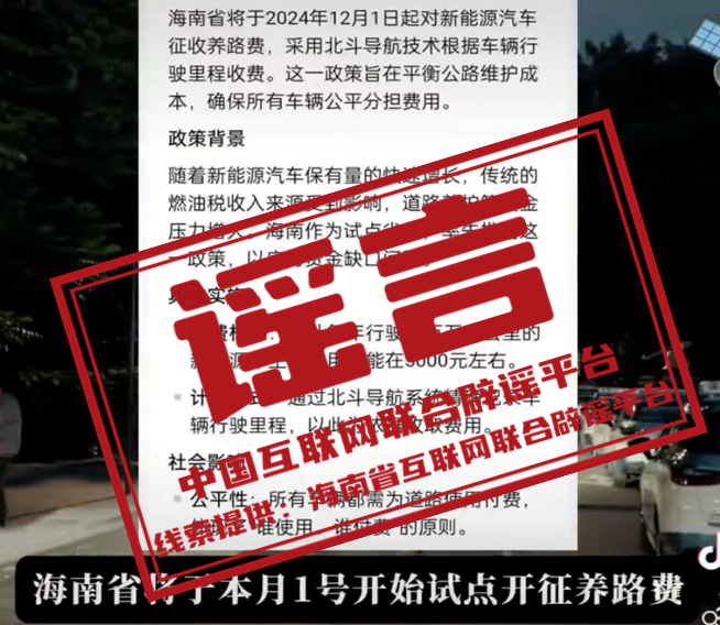 謠 言  海南12月1日起對新能源汽車征收養(yǎng)路費(fèi)?