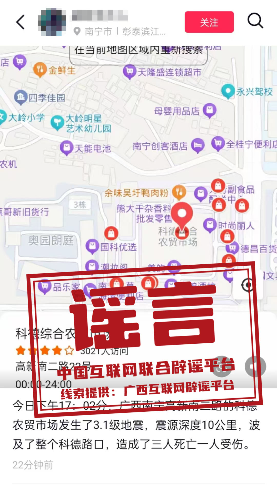 真相:2月12日,有網(wǎng)民在某短視頻平臺發(fā)文稱“今日下午17:02分,廣西南寧高新南二路的科德農(nóng)貿(mào)市場發(fā)生了3.1級地震?!苯?jīng)向有關(guān)部門核實,此信息為謠言。據(jù)廣西地震臺網(wǎng)和南寧市地震監(jiān)測中心數(shù)據(jù)顯示,南寧市及其鄰區(qū)無有感地震發(fā)生,亦無震情和災情信息反饋。目前,謠言線索已轉(zhuǎn)交相關(guān)部門對造謠者進行進一步調(diào)查處置。(來源:“廣西互聯(lián)網(wǎng)違法和不良信息舉報”微信公眾號、南寧市互聯(lián)網(wǎng)舉報·辟謠平臺)
